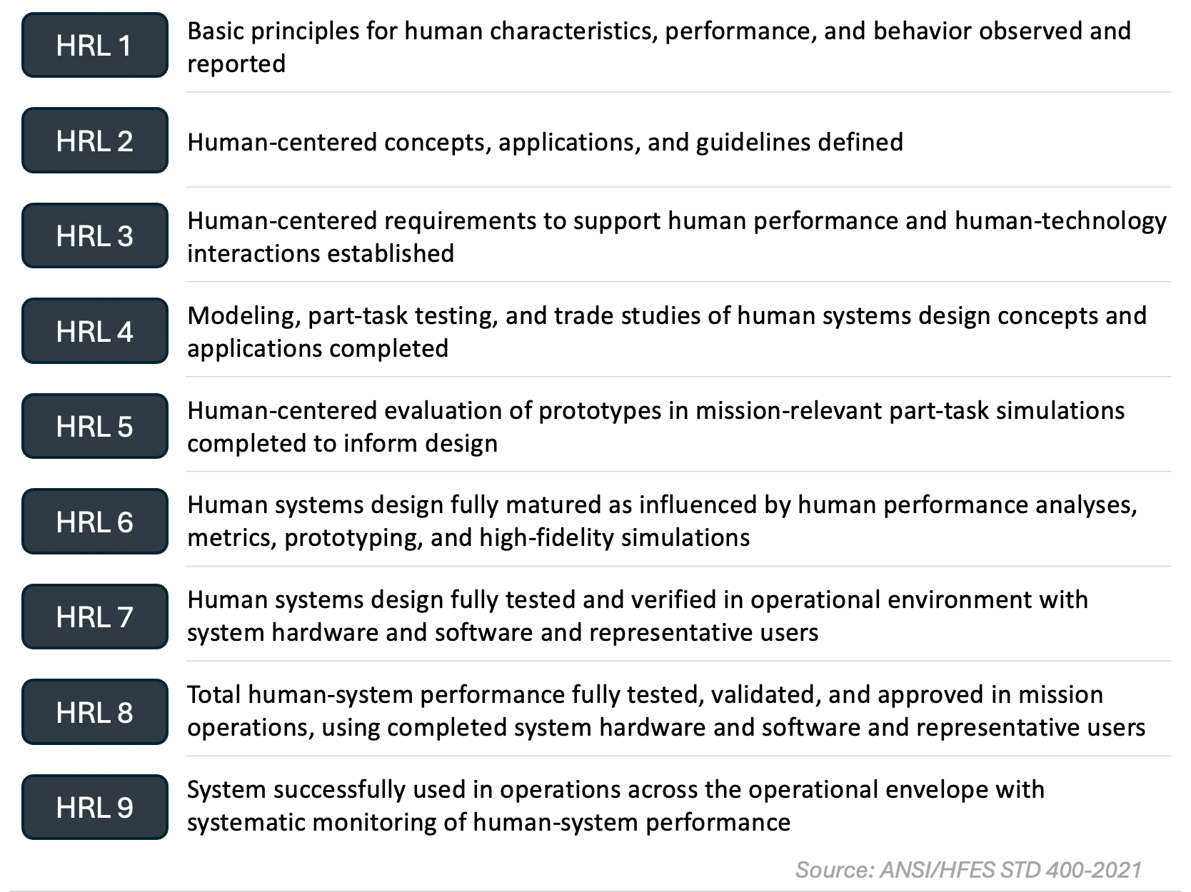 HRLs provide 9-level framework that rates a technology or system based on its readiness for human use. By systematically aligning human factors activities with HRL milestones, decision-makers gain traceable evidence that technology is not just functional, but also usable, safe, and sustainable in real-world operations.
